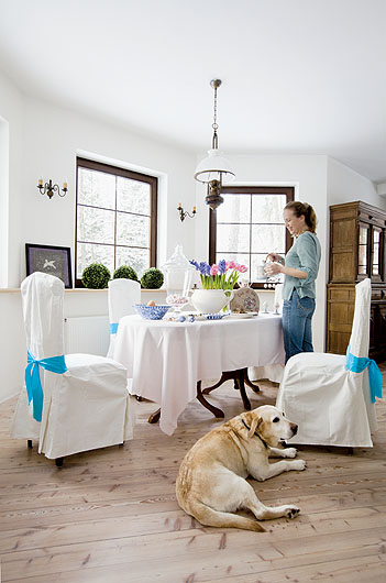 • Pełno tu serwetek wydzierganych z kordonka: różowe i białe w sypialni, zielone w łazience, niebieskie w kuchni.