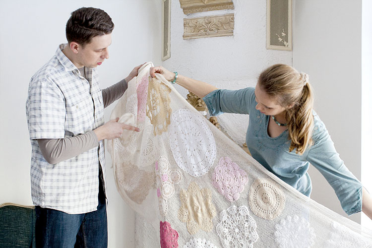Pełno tu serwetek wydzierganych z kordonka: różowe i białe w sypialni, zielone w łazience, niebieskie w kuchni.