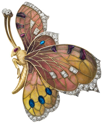 • W kształcie motyla. Złota broszka wysadzana diamentami i rubinami, Wiedeń, 1910 r., Rozert Fischmeister,