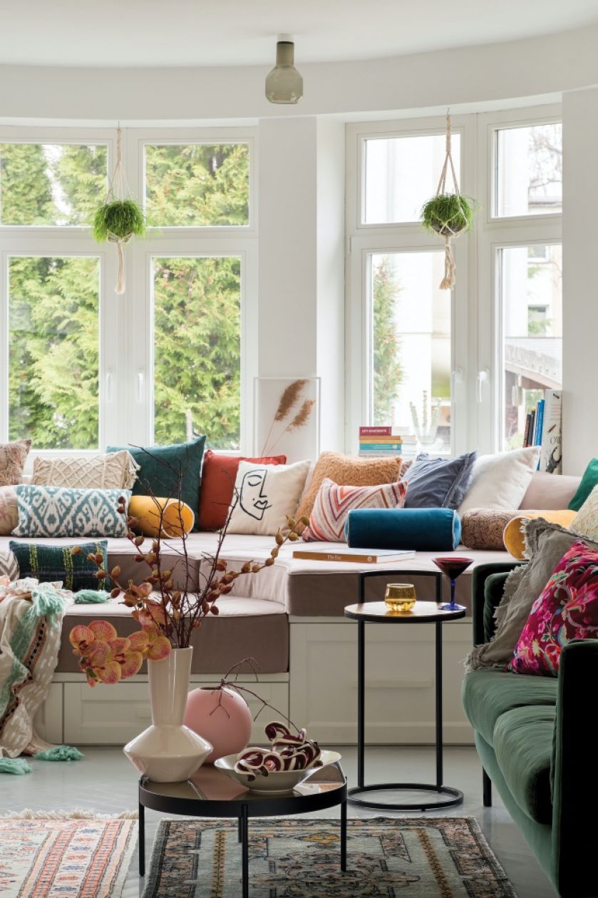 Dom typu kostka stworzony do odpoczywania – wnętrza urządzono pomysłami z podróży. Wykusz pełen poduszek zachwyca!