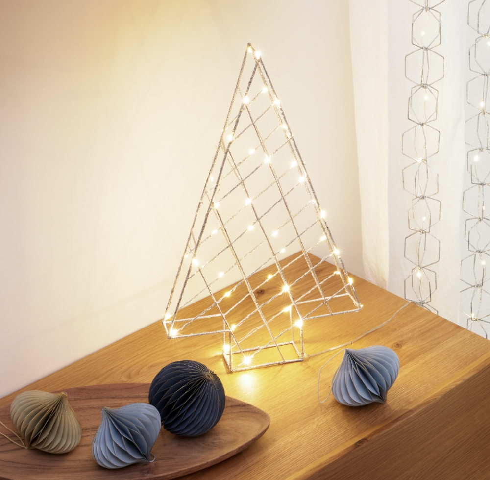 Świecąca choinka i bombki udekorują stolik, konsolę, komodę albo parapety, aranżacja marki Kave Home, kavehome.com/pl