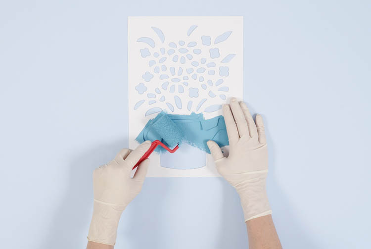 • szablon, farby: zielona, żółta, biała i niebieska, waleczek i tampon malarski