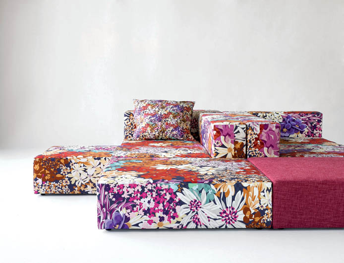 • Ten narożnik obity jest tweedem i grubą bawełną w kwiaty. Missoni