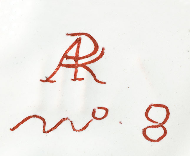 Charakterystyczna sygnatura manufaktury porcelany De Grieksche A, cyfra „8” oznacza numer wyprodukowanego naczynia.