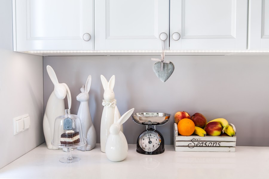 Na ścianach w kuchni konglomerat akrylowy w tonacji lekkiej szarości.