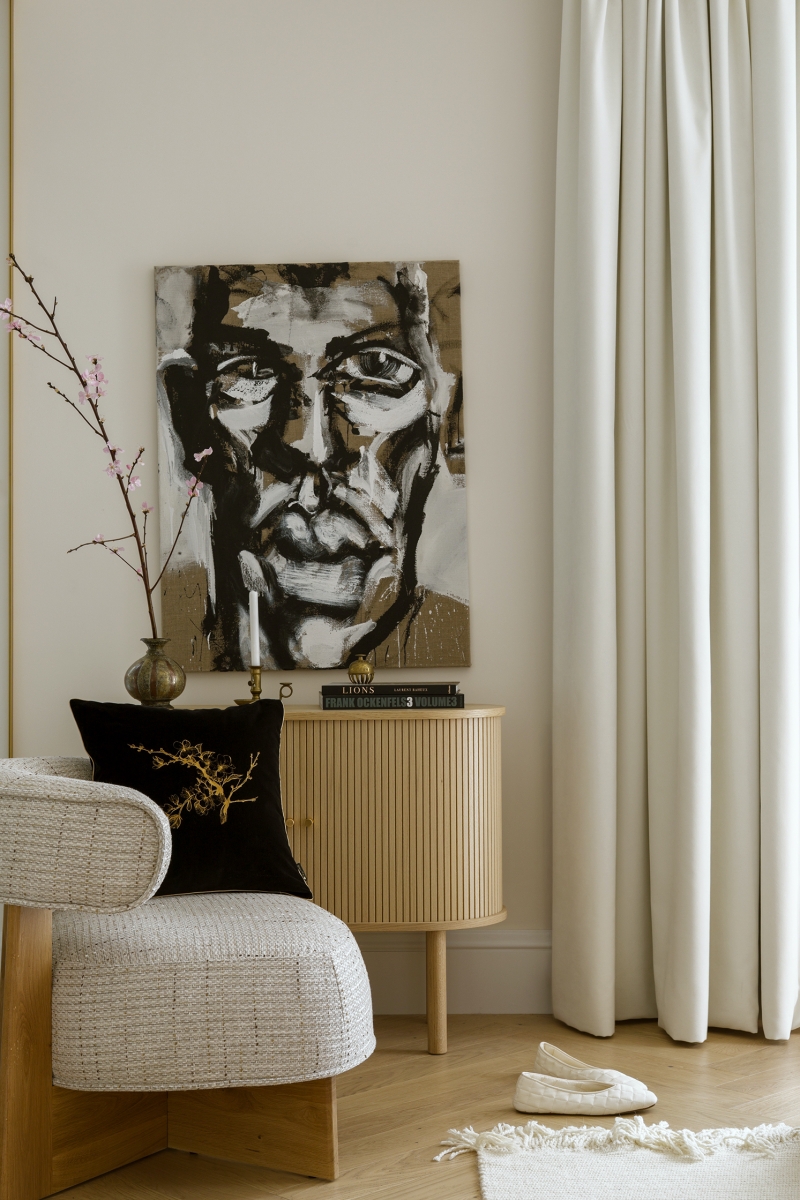 • kobiece mieszkanie z ryflowanymi meblami i sztuką