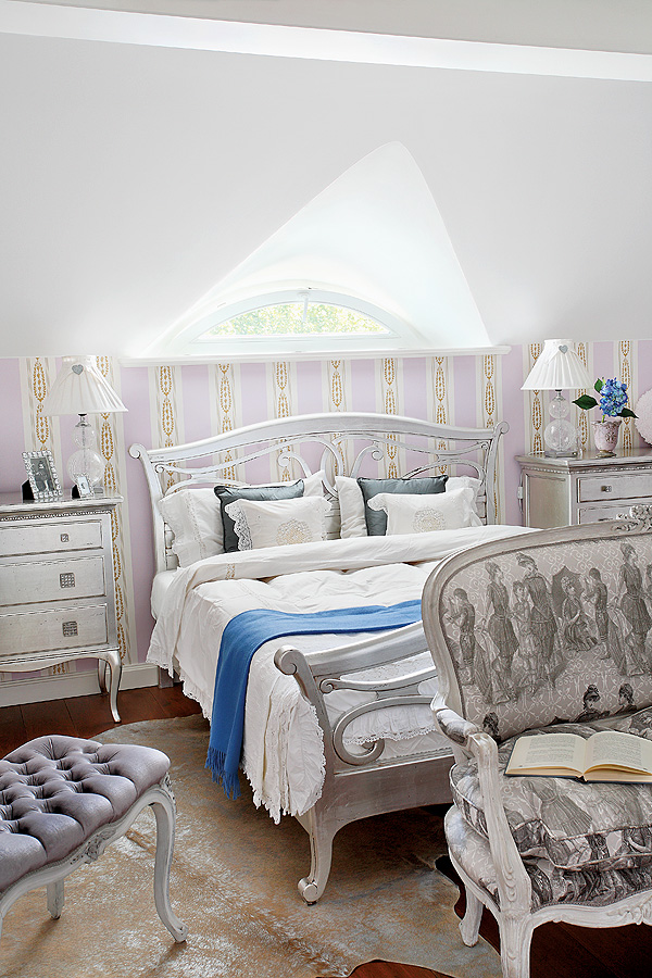 Sofka z tkaniną w damy, od której wszytko się zaczeło. Srebrne komódki zamiast nocnych stolików.