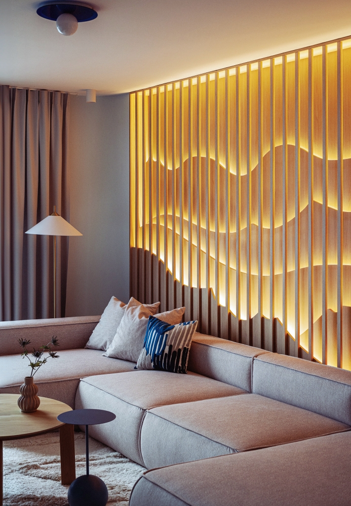 Ścianę-zabudowę z motywem fal zaprojektowały Marianna Matuszewska i Zuzanna Stefanowicz z Mesa Studio. Wykonana jest z płyt meblowych montowanych warstwowo na ścianie i podświetlonych ledami. Fot. H. Połczyńska, kroniki.studio, mesa-studio.pl