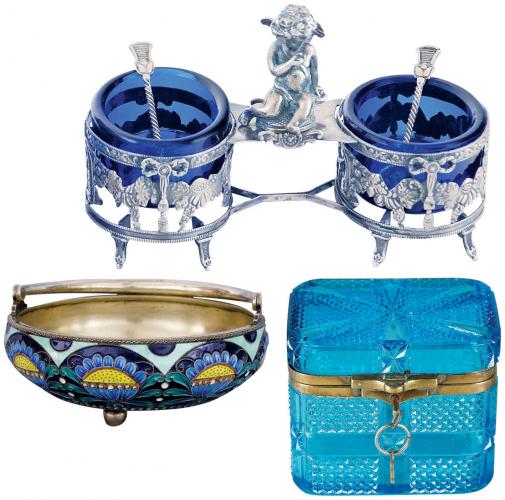 Naczynie do przypraw, Polska, poł. XX w., cw 2500 zł, REMPEX. Srebrna emaliowana, Leningradzka Fabryka Wyrobów Jubilerskich, lata 50. XX w., cw 2900 zł, OSTOYA. Szkło prasowane niebieskie, Ząbkowicka Fabryka Szkła, Polska, 1902-1914 r., cs 1100 zł, REMPEX