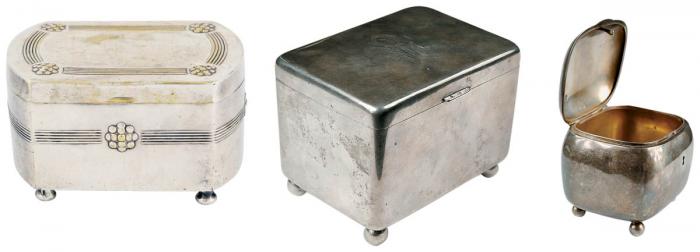 Mosiądz srebrzony, fabryka Braci Henneberg, Warszawa, ok. 1920 r., cw 1200 zł, REMPEX. Skrzynkowa, srebrna, z kluczykiem, Austro-Węgry, XIX w., cw 5000 zł, DESA KRAKÓW. Srebrna, wewnątrz złocona, grawerowany monogram ?BW?, XX w., cw 3300 zł, DESA KRAKÓW