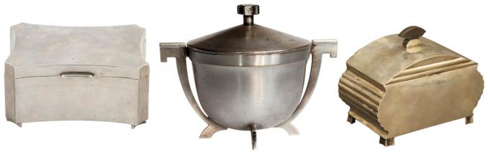 Skrzynkowa art d?co, złocona wewnątrz, Niemcy, lata 20.-30. XX w., cw 1900 zł, REMPEX. Mosiądz srebrzony, art d?co, fabryka Norblin i S-ka, Polska, ok. 1930 r., cs 1250 zł, DESA KRAKÓW. Cukiernica skrzynkowa, srebrna, uchwyt z hebanu, złotnik ?H.I.?, Warszawa, lata 20. XX w, cw 2900 zł, DESA UNICUM