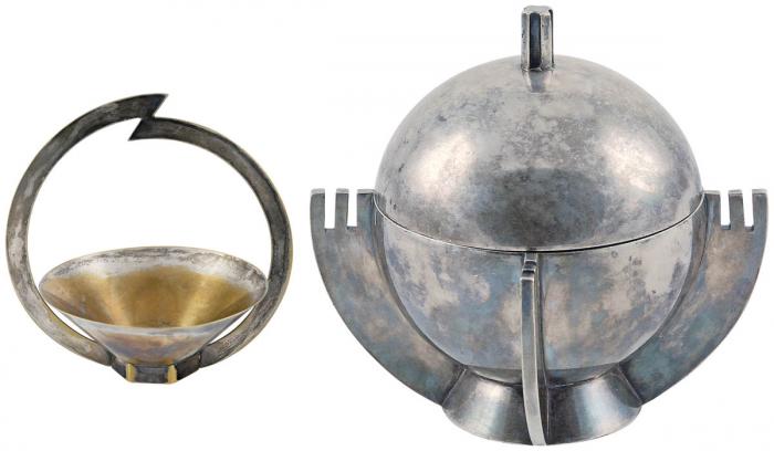 Plater srebrny na miedzi, w stylu art d?co, fabryka Braci Henneberg, Warszawa, ok. 1937 r., cs 800 zł, REMPEX. Cukiernica art d?co, Fabryka Wyrobów Srebrnych i Platerowanych Józef Fraget, projektant Julia Keilowa, Warszawa, ok. 1938 r., cs 3300 zł, REMPEX