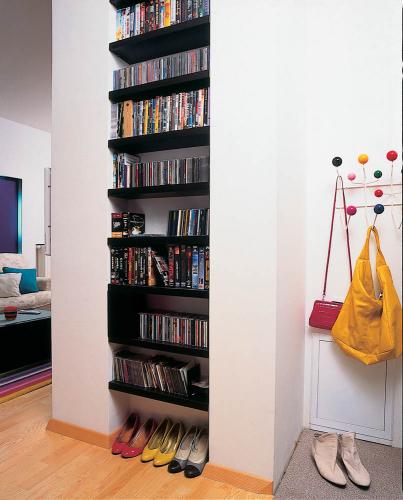 Kolorowy wieszak firmy Vitra projektu Charlesa Raya Eamesów, zajął miejsce wnękowej szafy.