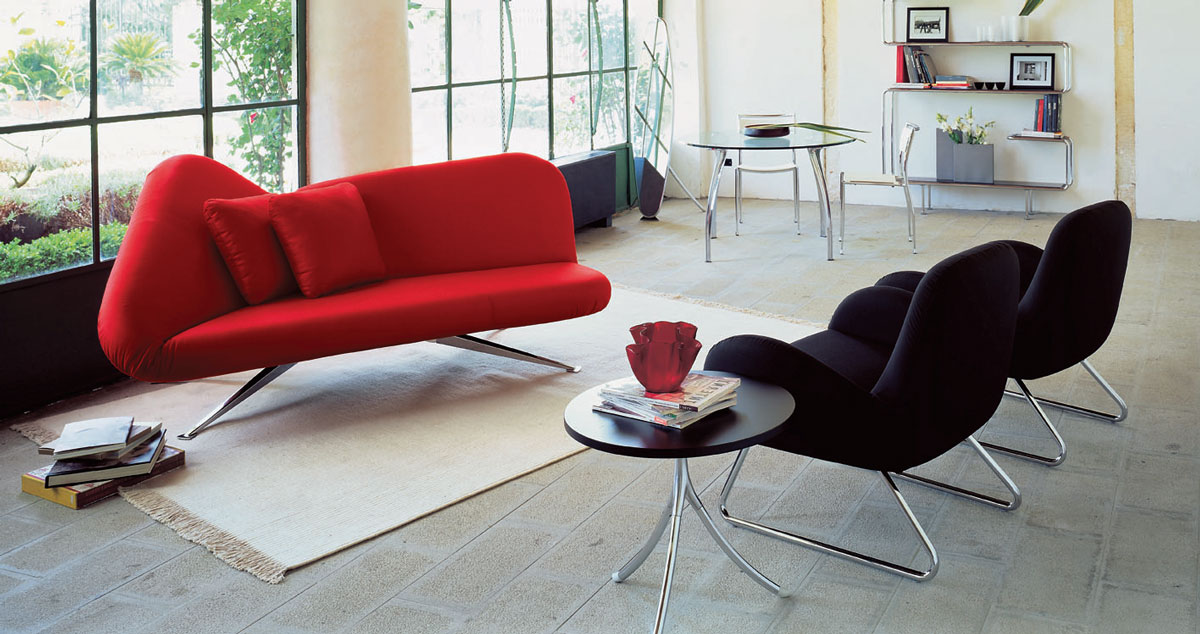 • Model Kira projektu Jamesa Bronte może być pokryty tkaniną lub skórą, z podstawą srebrną albo chromowaną. BONALDO