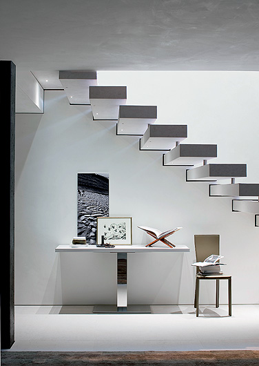 Konsola Elvis ma nogę ze stali nierdzewnej, a blat szklany lub laminowany. Kosztuje od 905 euro. Propozycja Cattelan Italia, Studio Italia