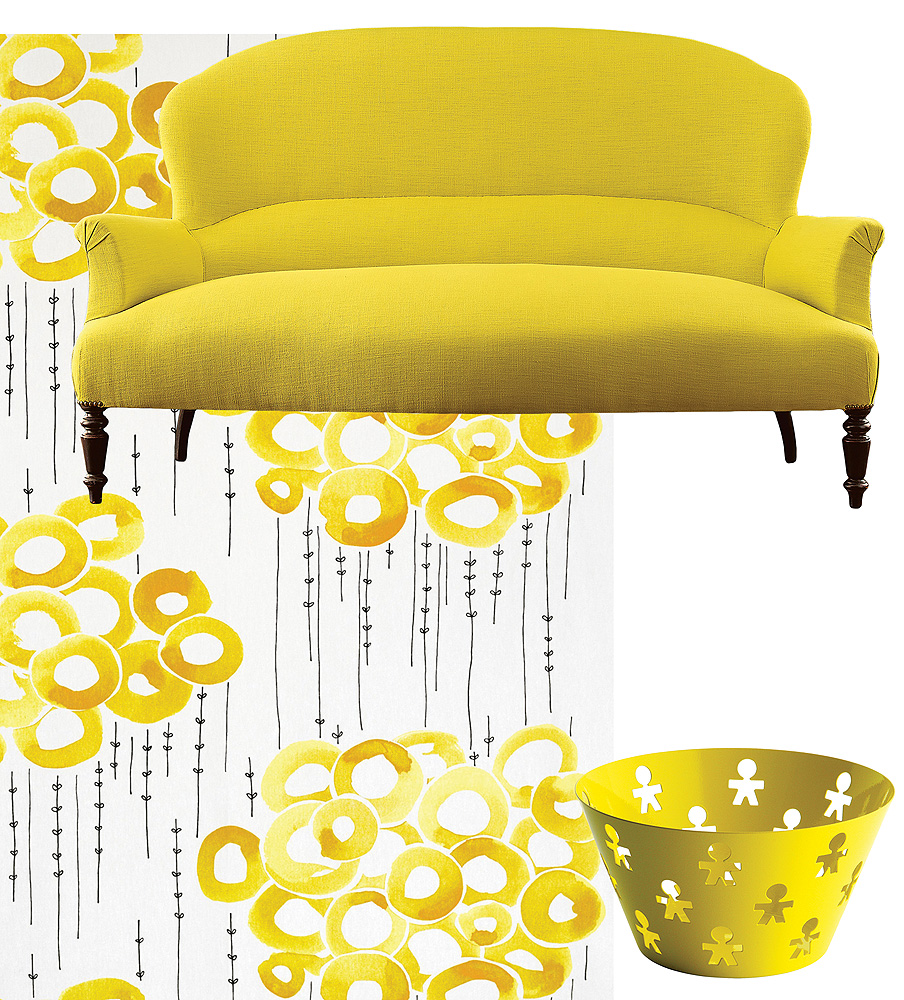 Colefax & fowler: nowość od Manuela Canovasa – sofa Fiona; Ikea: tkanina Stockholm, 19,99 zł oraz Fabryka Form: kosz Girotondo Poplike marki Alessi, 200 zł.