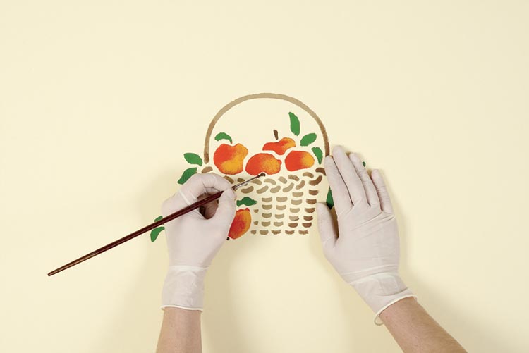 • Do namalowania kosza z jablkami potrzebne będą: szablon, farby: żółta, czerwona, zielona, beżowa, brązowa (jasna