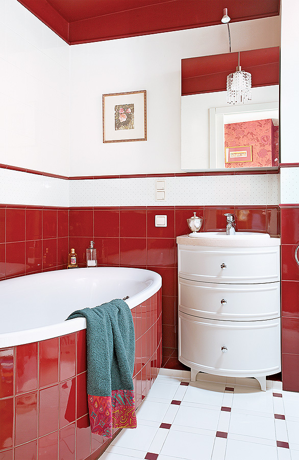 W łazience czerwień kafelków przełamana jest stylowymi białymi meblami.