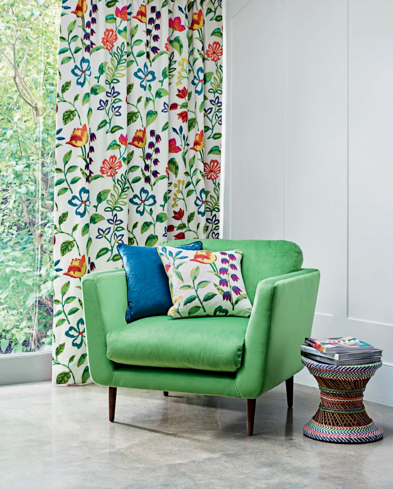 Tkanina Peacock z kolekcji Carnival marki GP & J Baker w kolorowe chabry, tulipany i dzwonki idealnie nadaje się na długie, lejące zasłony, ridex.pl