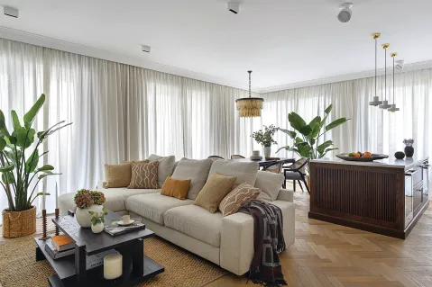 Kolonialne inspiracje we współczesnym wydaniu – łuki, rattan i ciemne drewno w przytulnym mieszkaniu na Powiślu