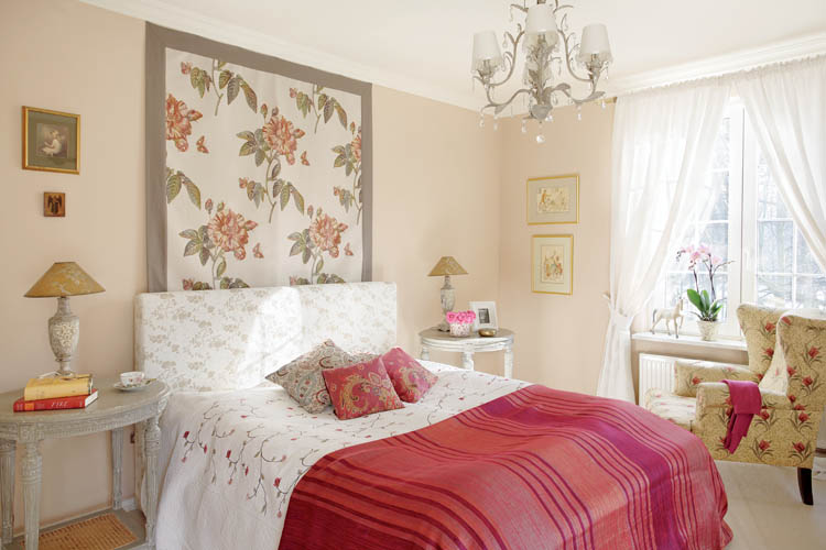 W sypialni także pojawiły się różowe akcenty w towarzystwie złamanych beżów.