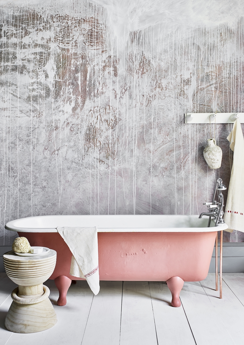 Nierówne ściany w łazience pomaluj farbą Chalk Paint™, przetrzyj pogniecioną gazetą, nadając chropowatą fakturę. Jeszcze raz nałóż farbę i pozwól jej spłynąć po ścianie. Taki efekt niedbale bielonego tynku to teraz hit, aranżacja Annie Sloan, anniesloan.com/pl