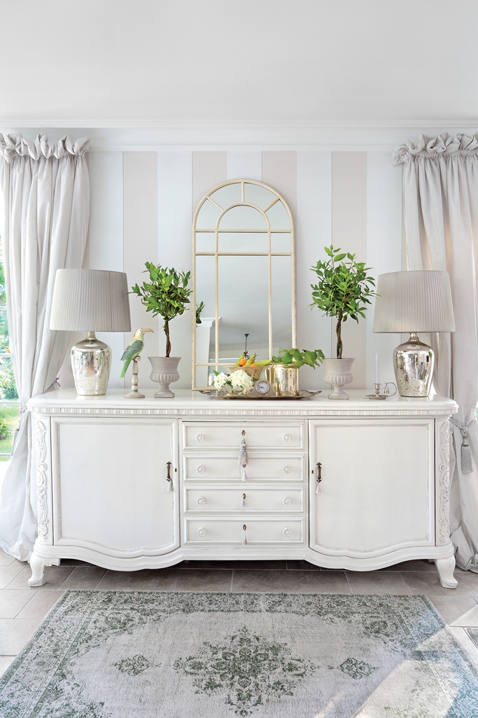 Pasy na ścianach to nie tapeta, malowała je architektka. Lustro – SKLEP LP, osłonki na nodze – BELLDECO, srebrny