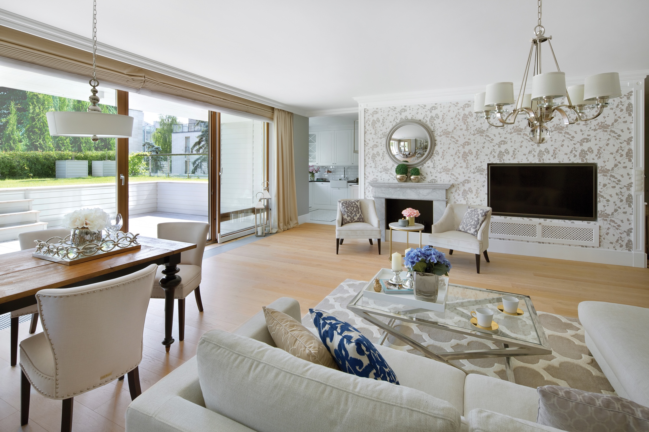 To mieszkanie jest leciutkie, ponadczasowe i eleganckie: klasyczne meble i dodatki, sztukaterie, stonowane kolory oraz oryginalna tapeta z wzorem liści brzozy. Widać tu rękę dwóch kobiet zakochanych w stylu Hampton i nowojorskich wnętrzach.