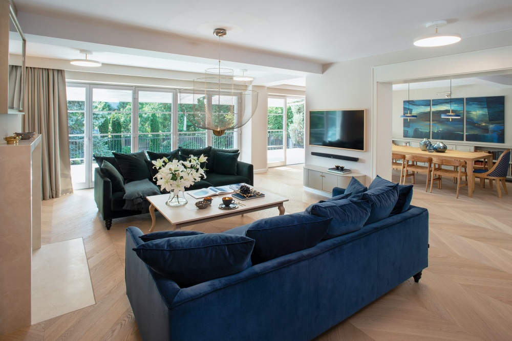 Zielona i granatowa kanapa w salonie