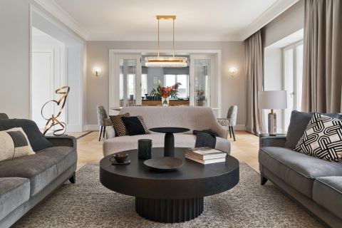 Szlachetne materiały, stonowane kolory i inspiracje art déco – eleganckie wnętrza modernistycznej willi na Mokotowie
