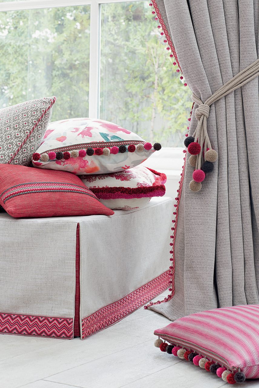 Pasmanteria Tivoli. Podpięcie zasłony Rialto, cena 712 zł, taśma Veneto ze szklanymi koralikami oraz taśma z pomponami – po 372 zł za metr, Romo.