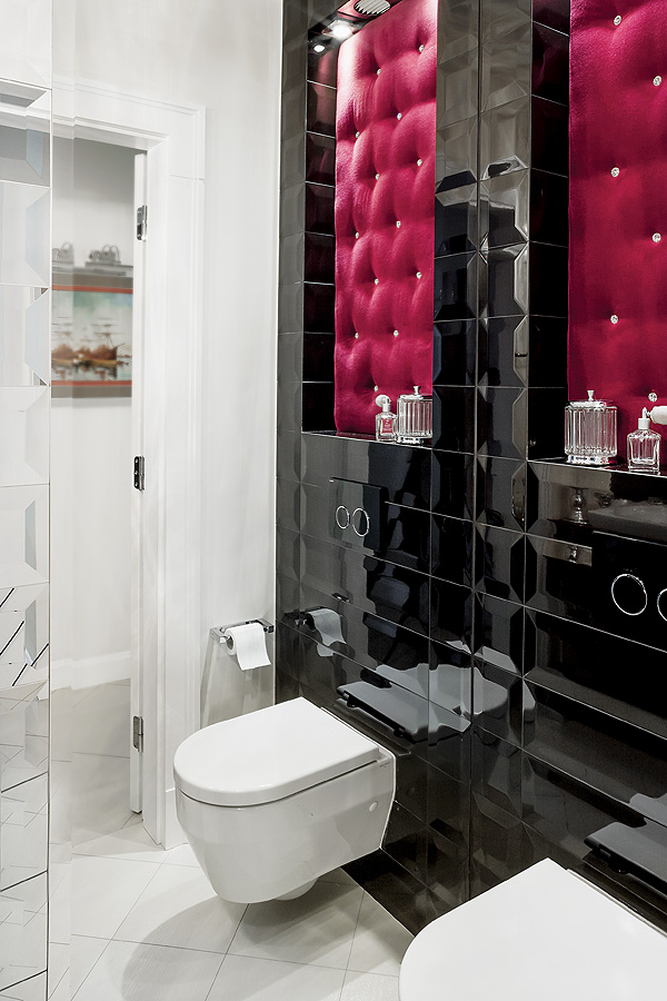 Zawsze zgrany duet - czerwień i czerń. Płytki Tubądzin Piccadilly Black, umywalki od Villeroy Boch, flakony i pojemniki