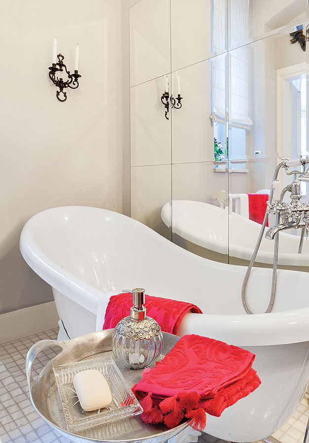 Przestronna łazienka z wolnostojącą wanną na ozdobnych, lwich nóżkach.