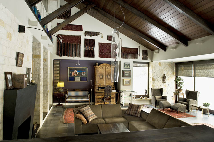• Salon z kamienia i drewna z otwarty stropem.