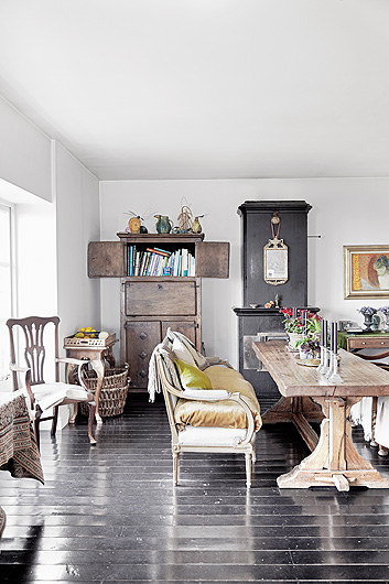 • Rustykalny stół został po dawnych właścicielach. Inspirowane barokiem krzesła są z rodzinnego domu Kristine w Danii.