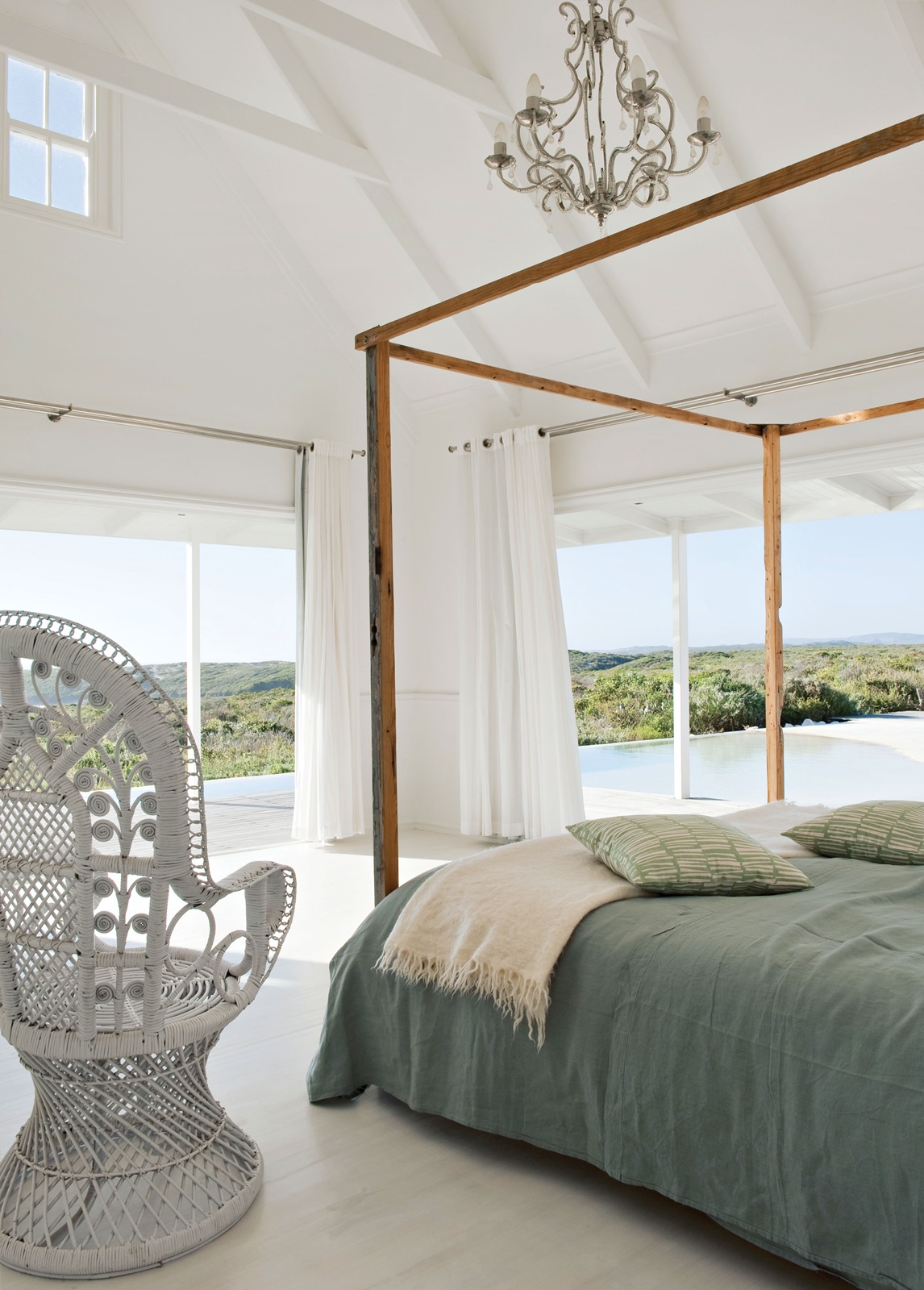 Sypialnia w krajobrazie. Gina i Rob zrezygnowali z tradycyjnych ścian po to, by mieć widok na busz i ocean. Meble – tylko naturalne: marokański dywan pleciony z traw, ażurowy fotel z Loft Living, łóżko wykonane z recyklingowanego drewna.