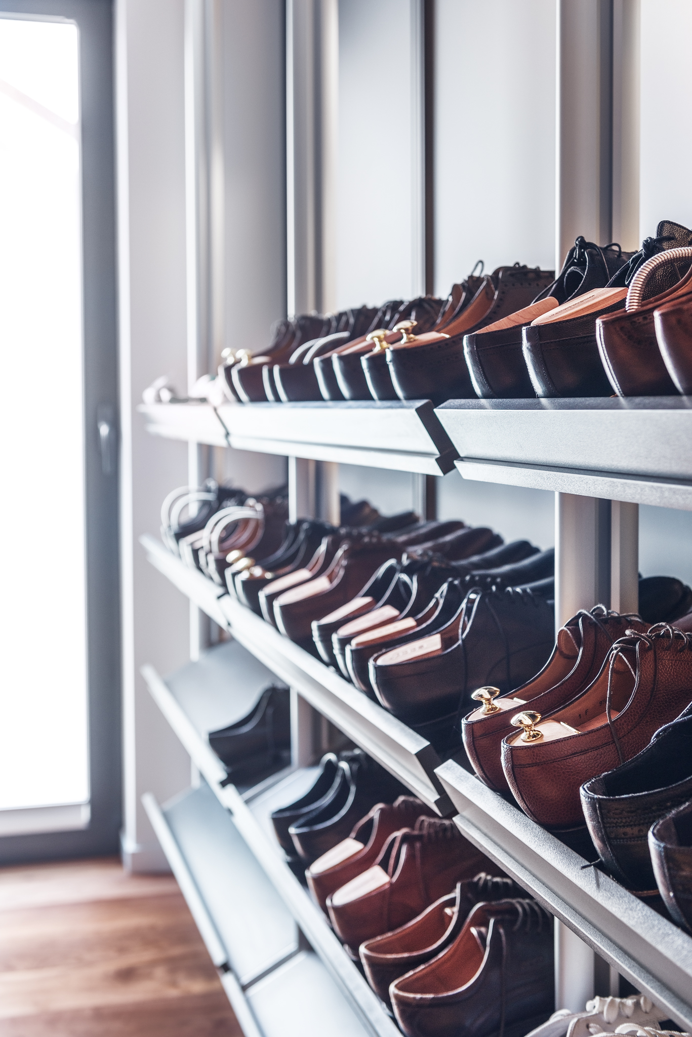 Nie tylko kobiety potrzebują sporo miesjca na buty. Praktyczne półki znalazły się w garderobie.