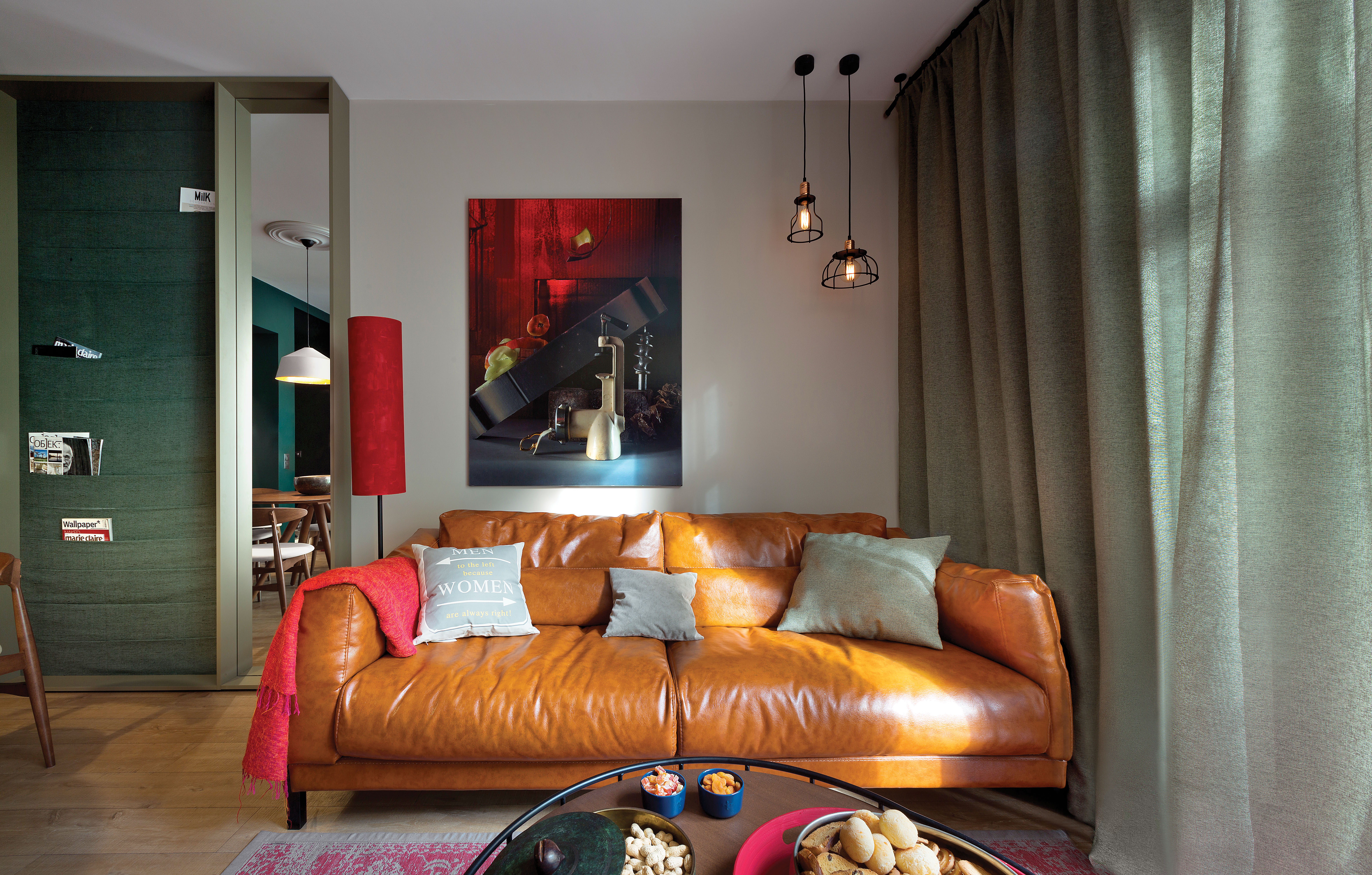 Łóżko na całą sypialnię, przepastna sofa, ściana z kieszeniami. O tak wygodnym mieszkaniu marzy każdy singiel.