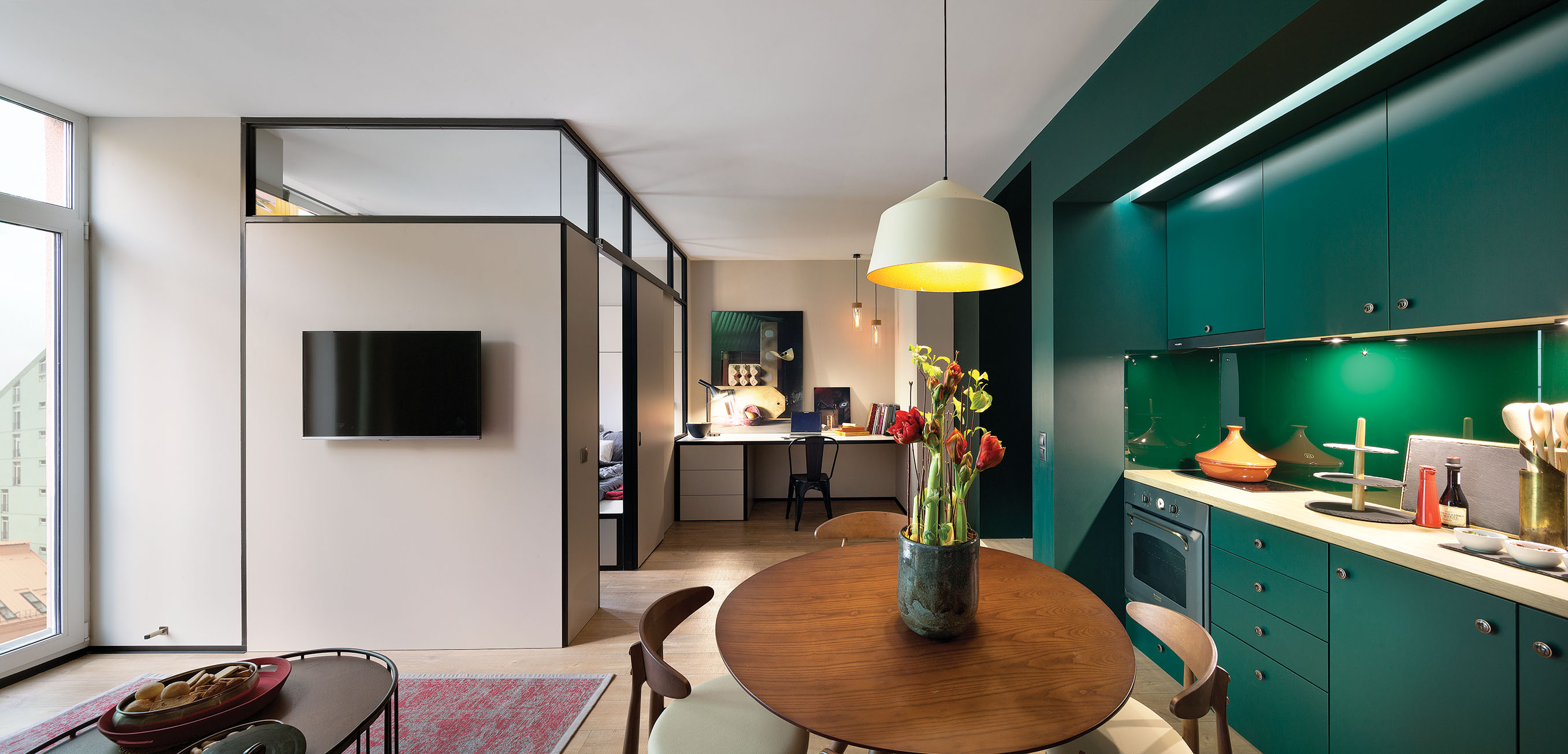 Łóżko na całą sypialnię, przepastna sofa, ściana z kieszeniami. O tak wygodnym mieszkaniu marzy każdy singiel.