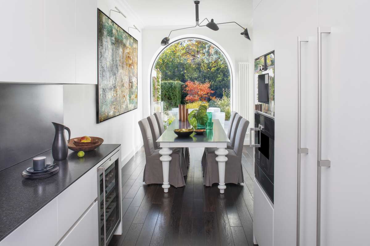 Stół z metalowym blatem – Gervasoni, lampa – Serge Mouille. Drzwi, okna i schody na wzór oryginalnych zrobiła polska