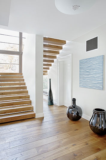 Dębowe schody to pomysł architekta Patryka Matyja, są jak dzieło sztuki. Stopnie łączą się z murem tylko z jednej strony, pozostawiając wrażenie lekkości i tajemnicy.