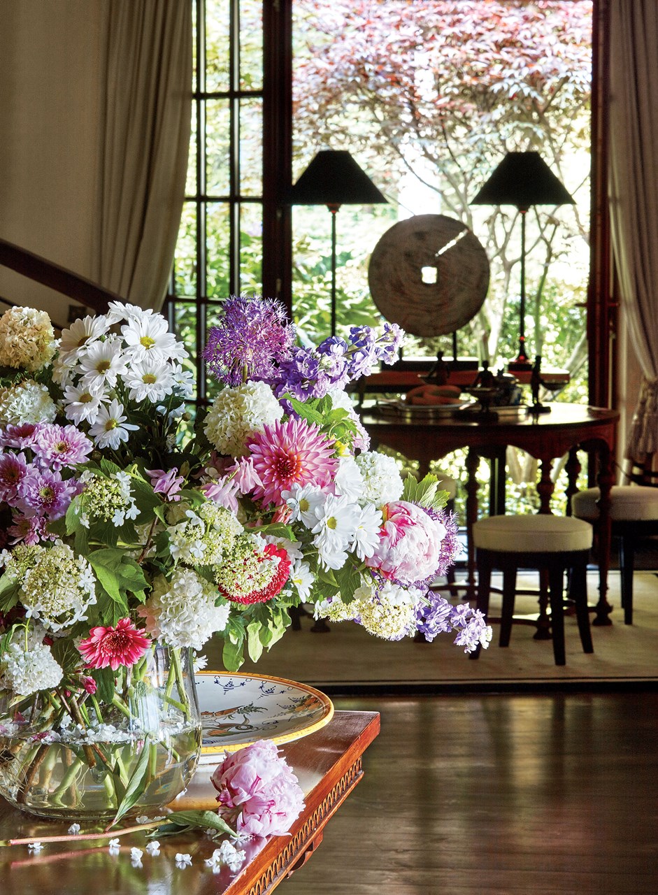 Latem drzwi do ogrodu są szeroko otwarte. Bujna zieleń wchodzi do wnętrz. To najpiękniejszy żywy obraz w tym domu, zmieniający się wraz z porami roku.