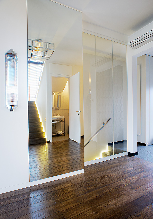 • Największe wrażenie w sypialni robi ściana z lustrami. Łóżko ze sklepu NAP. Garderobę zaprojetowała pracownia
