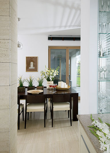 • Do jasnych ścian i podłóg dobrano dla kontrastu ciemonobrązowy stół od Vinotti.