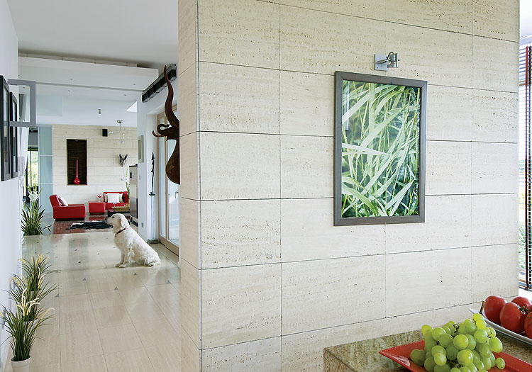 • W salonie z trawertynowo-granitowym kominkiem stanęła duża afrykańska rzeźba z Konga.