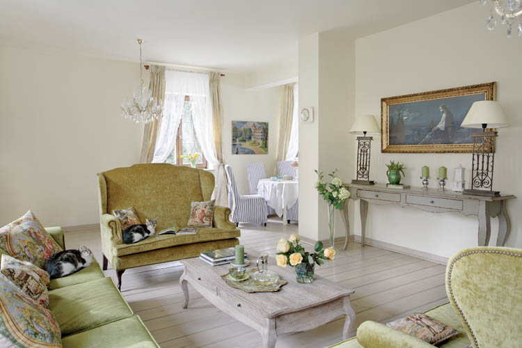 Zielone kanapy, które Agnieszka znalazła w Hiszpanii doskonale pasują do salonu w toskańskim stylu.