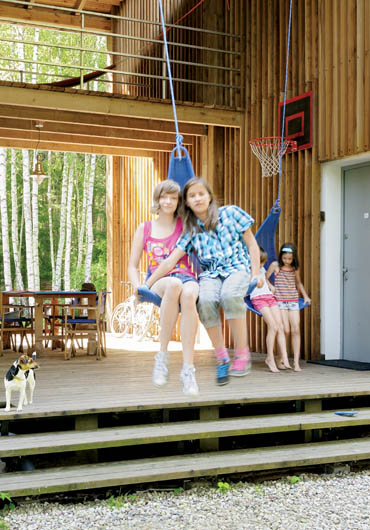 Taras z huśtawkami to ulubione miejsce zabaw dzieci. Olga i Anielka, córki malarza, bawią się z koleżankami pod czujnym okiem Figi, terierki rasy Jack Russell.