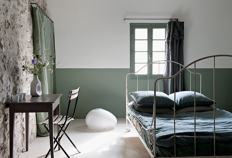 Luc z sąsiedztwa wymyślił, by ściany do połowy pomalować je na ciemnozielony kolor, a od połowy na jaśniejszy odcień. Marie dorzuciła do tego ciemnozieloną kotarę zamiast drzwi do szafy i metalowe białe łóżko.