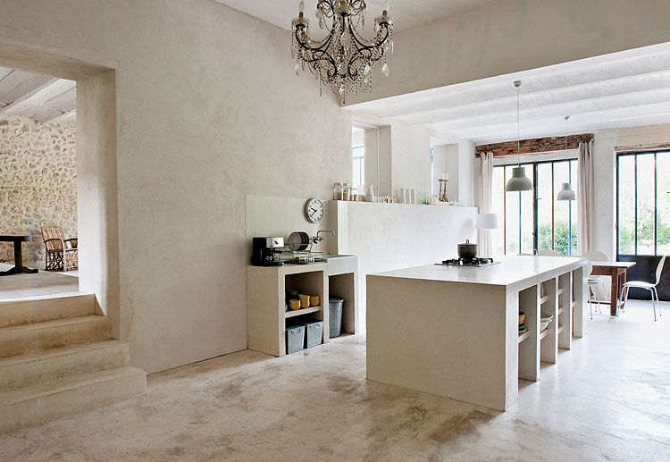 • Trzymetrowa wyspa jest zrobiona z betonu - surowy materiał świetnie pasuje do kamiennej ściany.