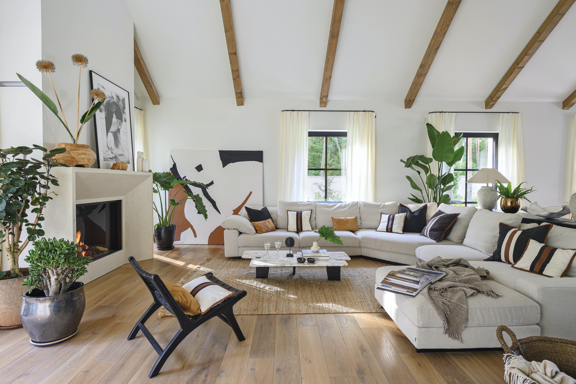 Ogromna sofa w kształcie litery „U” z firmy Dion. Stolik kawowy z marmurowym blatem – Marazzi. Fotel z SF MEBLE, wełniany dywan z WESTWING.